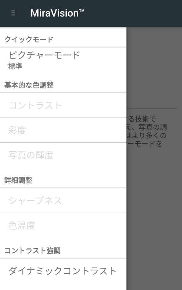 スマホの画面調整は、Androidの機能だけだと、明るさクライ(CRY)しかできないグァ、REIには「MiraVision」という、画質調整機能が搭載されている。