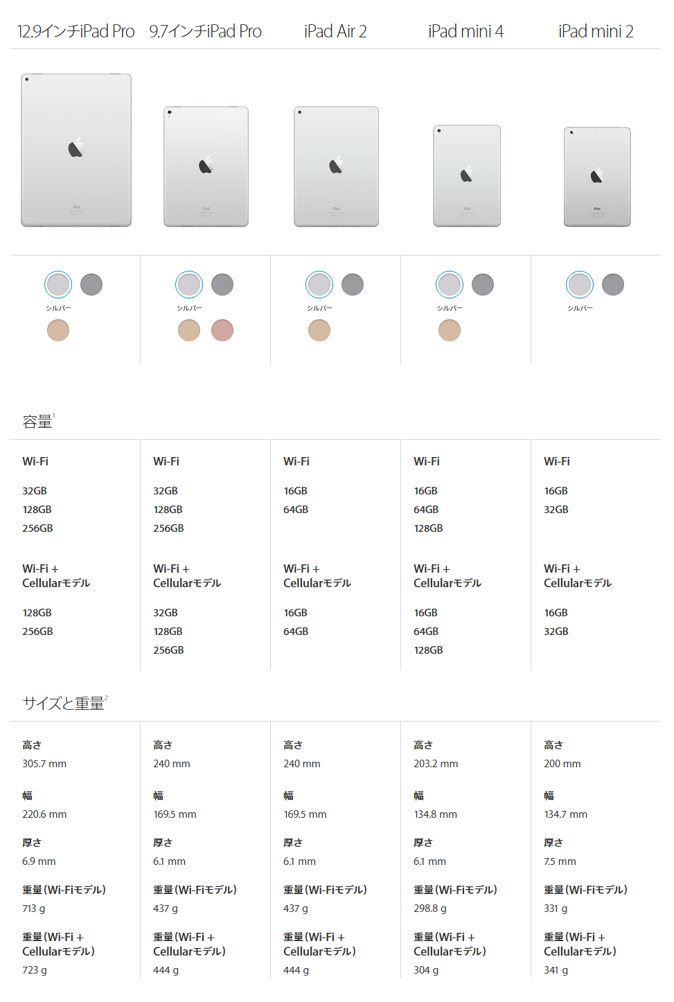 先日発表されたiPad Pro(9.7型)には、32GB、128GB、256GBしかなく、最小でも32GBだが、ソノ発表により値下がったiPad Air2には、16GBモデルが存在する。